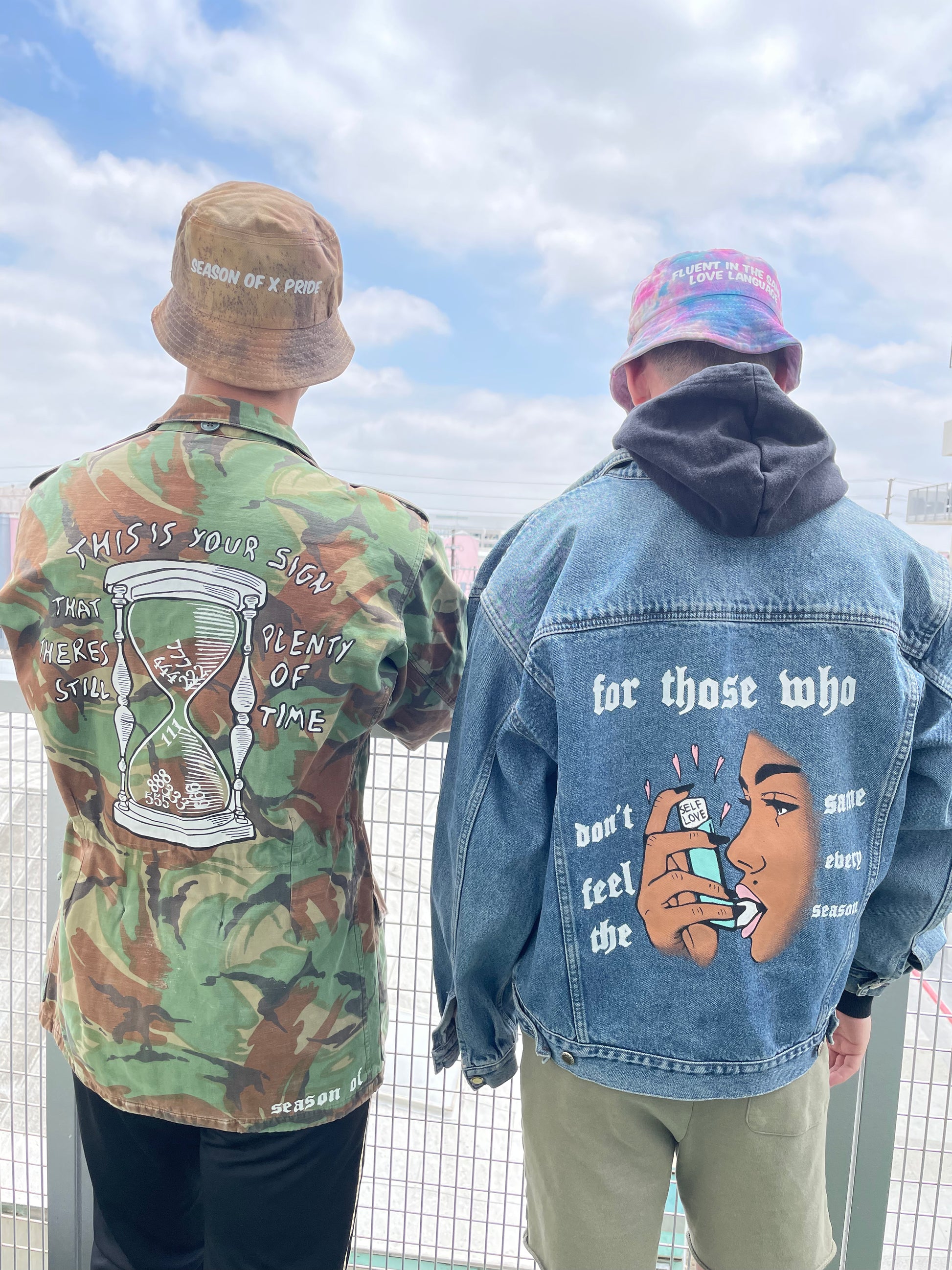 Refresh your favorite "fit" with our oversized denim jacket featuring the original image from our "Self-Love Collection" hoodie design with hand-painted imagery, logo, and text on back, button-front closure and dual flap pockets.